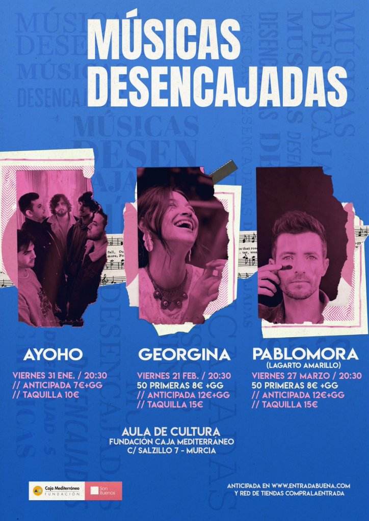 Ayoho (31 de enero), Georgina (21 de febrero) y Pablo Mora (27 de marzo) son los artistas a los que podremos ver este año. Los conciertos, bajo la organización de Son Buenos y la Fundación Caja Mediterráneo, serán todos a las 20:30 horas en Aula de Cultura Fundación Caja Mediterráneo.